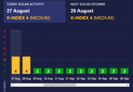 Завтра (28 августа) ожидается аналогичный геомагнитный показатель.