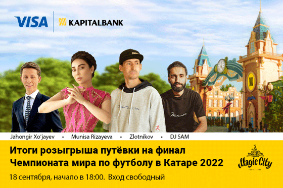 Завершается первый этап акции, организованной Visa и Kapitalbank, в рамках которой будет разыграна путёвка на финал чемпионата мира по футболу-2022 в Катаре. 18 сентября в 18:00 в столичном Magic city состоится торжественное праздничное мероприятие, где организаторы объявят имя счастливого обладателя данного приза.