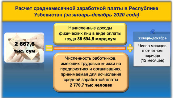 В Узбекистане среднемесячная номинальная начисленная заработная плата в 2020 году составила 2 млн 667 тысяч сумов, что на 14,8% больше по сравнению с 2019 годом, сообщает Госкомстат.