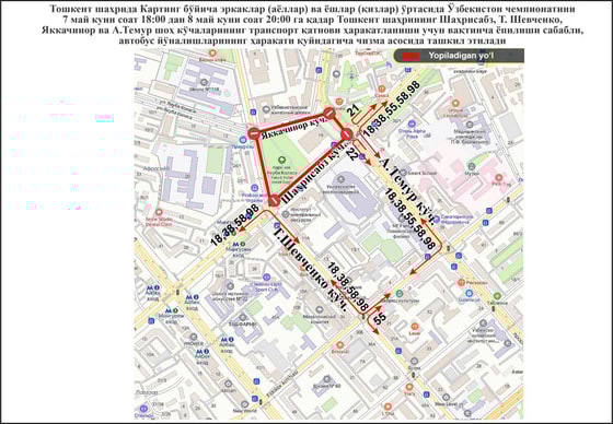 В Ташкенте на день перекрыли дороги вокруг парка имени Якуба Коласа из-за чемпионата Узбекистана по картингу. Об этом сообщает пресс-служба «Тошшахартрансхизмат»