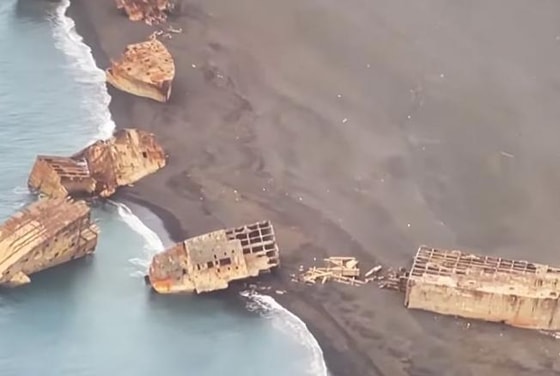 Это транспортные суда Японии, которые были захвачены американскими войсками во время битвы за Иводзиму. Их переместили в западную часть острова и использовали в качестве волнорезов.