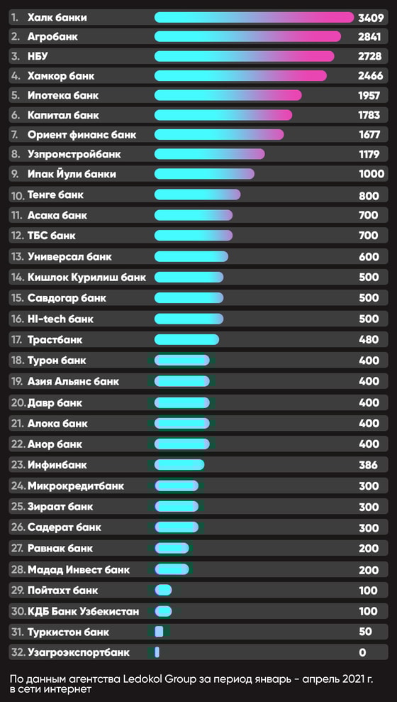 Для составления рейтинга были проанализированы упоминания 32 банков Узбекистана в узбекском сегменте Интернета в социальных сетях и онлайн СМИ. Популярность в сети показывает интерес и значимость каждого отдельного банка для людей, уровень доверия, народную популярность и уровень репутации.