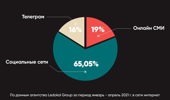 Более половины упоминаний (65%) были размещены в социальных сетях. На Telegram приходится 16% и на онлайн СМИ 19% от всех упоминаний соответственно.