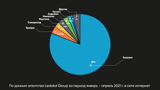 В число лидеров также вошли Бухара, Самарканд, сразу 3 города Ферганской долины (Фергана, Наманган, Андижан), а также Ургенч. На остальные регионы суммарно пришлось 4% всех упоминаний. С развитием и проникновением Интернета в регионах, доля упоминаний в них будет возрастать, как это происходит в других странах.