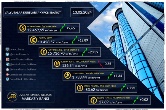 Курс доллара составил 12 469,65 сумов (+9,65), фунта 15 736,70 сумов (+23,39), евро 13 428,57 сумов (+12,89), а рубля 136,84 сумов (-0,35).