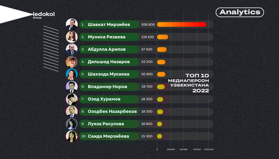 Ожидаемо, рейтинг упоминаний возглавил президент Республики Узбекистан Шавкат Мирзиёев со значительным отрывом от остальных участников, набрав 939 000 упоминаний за 2022 год.