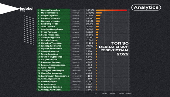 С каждым годом растет популярность и влияние на общественное мнение блогеров и журналистов. Так, в топ медиаперсон вошли: Дильшод Назаров (@dili.me), Озод Хурамов, Даулетмурат Тажимуратов и другие.