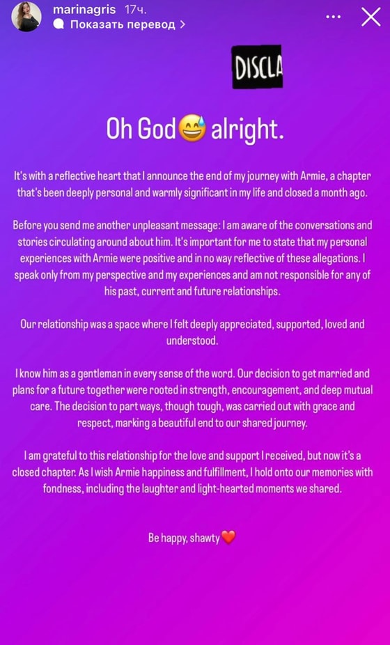С трепетом объявляю об окончании нашей истории с Арми. Эта глава была глубоко личной и по-настоящему значимой в моей жизни и завершилась месяц назад. Я в курсе всех разговоров о нем. Мой личный опыт общения с Арми был положительным и никоим образом не отражает обвинения, – написала она.