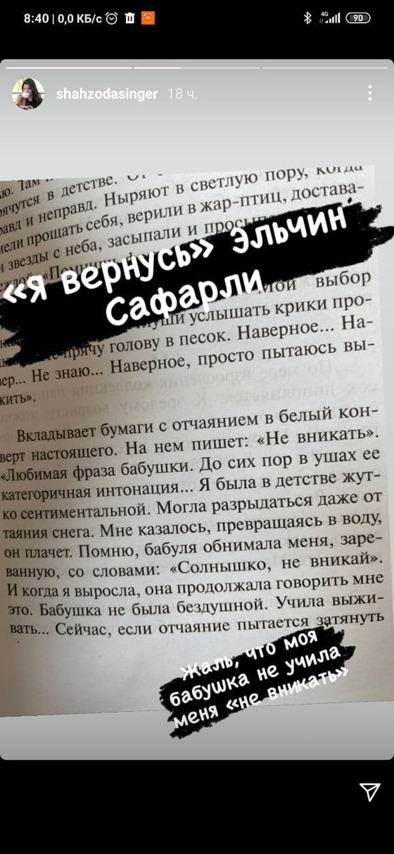 Это не первый случай, когда Шахзода озадачивает поклонников грустными, неоднозначными постами. Недавно она выложила пост со страницей из книги Эльчина Сафарли «Я вернусь».