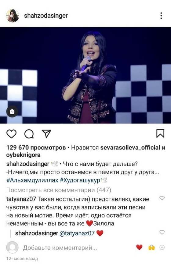 Вчера вечером известная певица Шахзода выложила архивное видео с концерта. Это выступление 2017 года на песню Qarama ko`zlarimga.