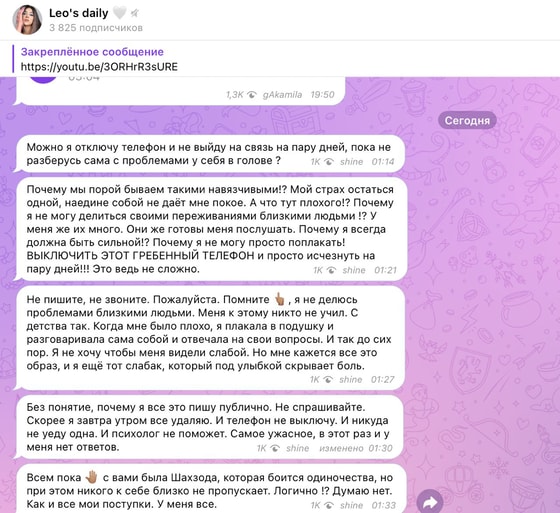 Девушка написала несколько сообщений в свой Telegram-канал «Leo’s Daily», где поделилась своими эмоциями и чувствами.