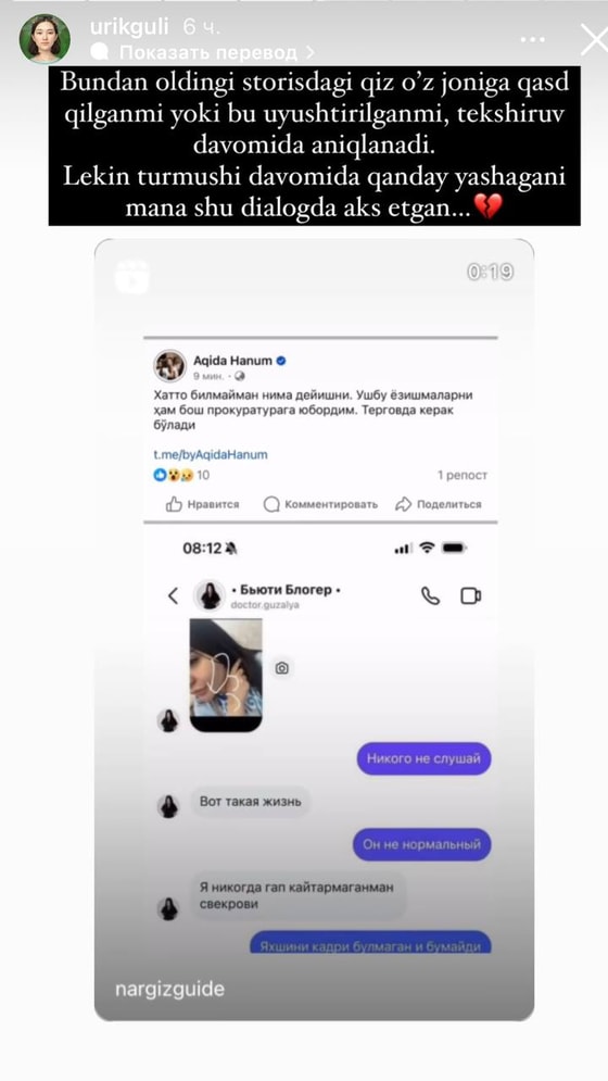 В сети появились многочисленные свидетельства, указывающие на то, что она могла стать жертвой домашнего насилия и преследования со стороны своего супруга и свекрови. Многие знакомые Гузали высказывают мнение, что её муж и свекровь могут быть причастны к её смерти или, по крайней мере, поспособствовали её самоубийству. По имеющимся данным, свёкор Гузали занимает высокую должность в системе здравоохранения Самарканда.