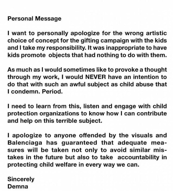 Я хочу лично извиниться за неверный творческий выбор концепции съемки с детьми, я беру на себя за это ответственность. Было неприемлемо привлекать детей к демонстрации предметов, не имеющих к ним никакого отношения. Иногда я люблю провоцировать публику своими работами, но у меня НИКОГДА не было намерения связывать их с такой ужасной вещью, как жестокое обращение с детьми. Я такое осуждаю. Точка, – написал Демна.