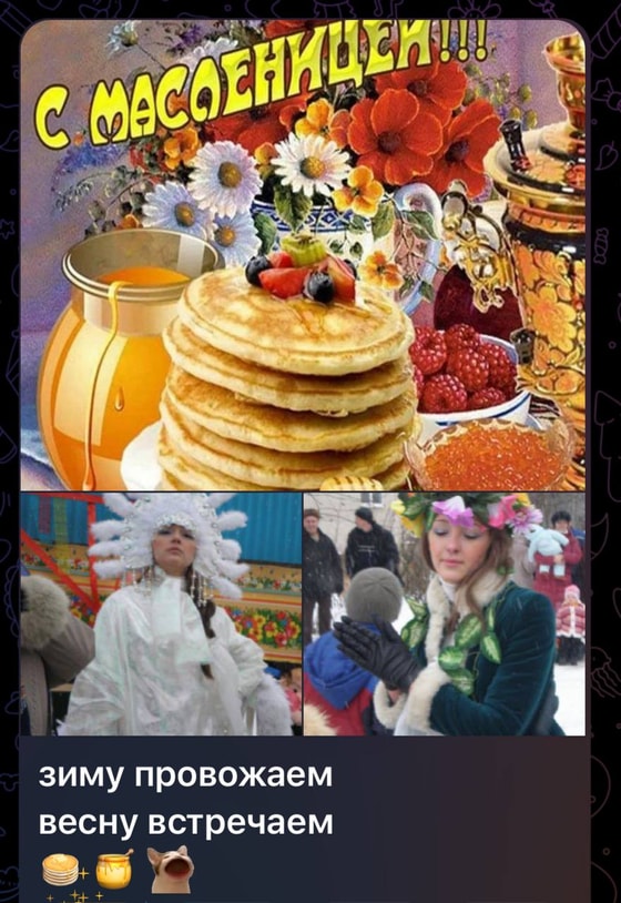 На одном из фото Ивлеева позирует в венке из цветов и с лианой на шее — символах приближающейся весны. На другом же предстает в зимнем наряде с головным убором, напоминающим корону Снежной королевы. Завершает публикацию традиционная масленичная открытка с изображением блинов.