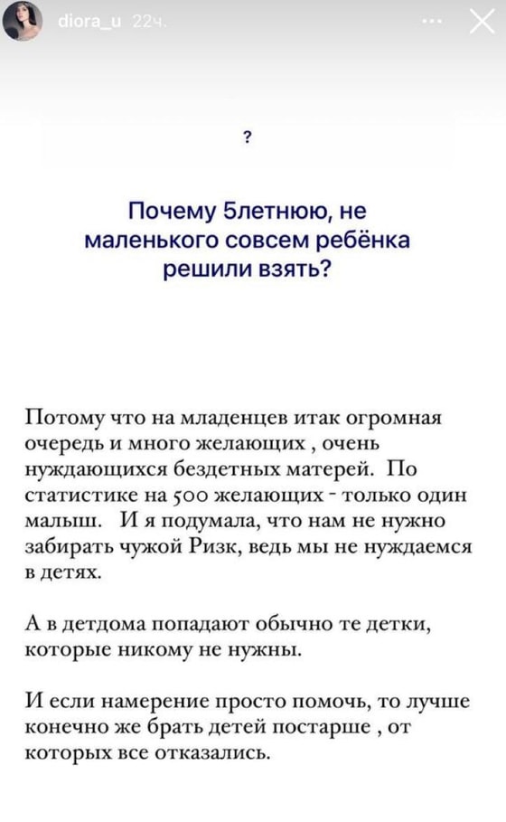 В декабре прошлого года узбекский блогер и бизнесвумен Диера Усманова удочерила пятилетнюю девочку по имени Аиша. Многие пользователи задавались вопросом, почему же именно более взрослого ребенка, а не младенца.