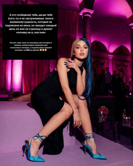 Дина Саева обратилась к хейтерам (сущностям) и похвасталась тем, что пока они заходят на её страницу и смотрят сторисы, поднимая тем самым охваты, она подписывает контракт на 50 млн. Позже этот сторис был удалён