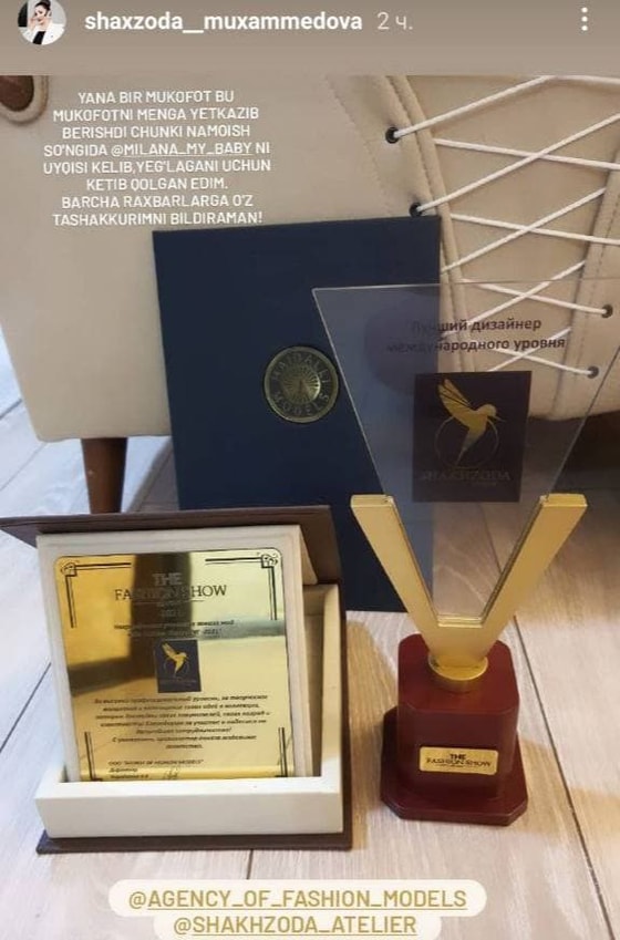 Узбекский дизайнер и актриса Шахзода Мухаммедова обрадовала своих поклонников новостью о том, что удостоилась новой награды.