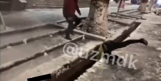 Мужчина, чтобы избежать снега отошёл на два шага назад, не заметив, что сзади арык. В итоге он перевернулся и упал в арык головой.