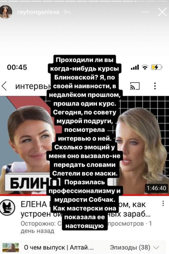 Участницей нового выпуска YouTube-шоу скандальной Ксении Собчак «Осторожно: Собчак» стала автор марафона личностного роста Елена Блиновская. Разговор девушек был крайне эмоциональный и чуть ли не дошел до скандала.