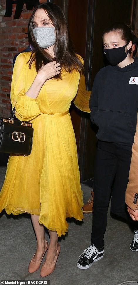 Было для всех удивительно видеть Джоли в несвойственном для неё образе, ведь впервые за долгое время она сменила свой фирменный черный готический гардероб на ярко-желтое свободное платье до колен.