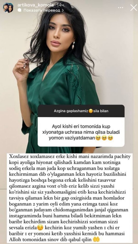 Лично я сталкивалась с такими ситуациями. Хочу сказать, вы не сможете представить другого человека рядом с собой. Спустя время ваш муж обязательно придет к вам с извинениями и скажет, что не сможет без вас жить. Я советую простить его. К примеру, я узнала об измене на втором месяце беременности – я истерила и выкладывала все в Instagram. Но я смогла простить и прошу, чтобы и вы простили, закройте на это глаза. Знаете, уйдет один плохой муж и не факт, что второй окажется лучше. Это все испытания от Всевышнего, – заявила Камола Артикова.