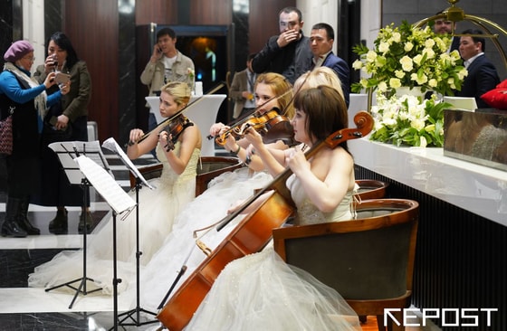 Посетители прошлись по красной дорожке, которая вела в основной вход в отель, где их уже поджидали талантливые скрипачи и фуршет.