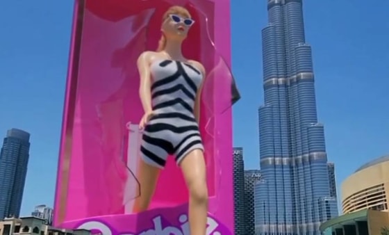 Перед знаменитым небоскребом Бурдж-Халифа расположили гигантскую 3D-модель Барби в ее культовых солнцезащитных очках и купальнике в черно-белую полоску.