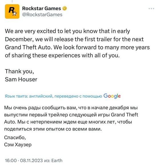 К слову, к игрокам обратился лично Сэм Хаузер, поблагодарив их за невероятную поддержку, отметив, что без них не было бы ни Rockstar Games, ни тех выдающихся игр, которые разрабатывает компания.