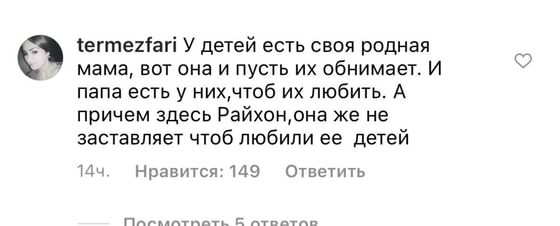 У детей есть своя родная мама, вот она пусть и обнимает. И папа есть у них, чтобы любить. Причём здесь Райхон? Она же не заставляет, чтобы любили ее детей,