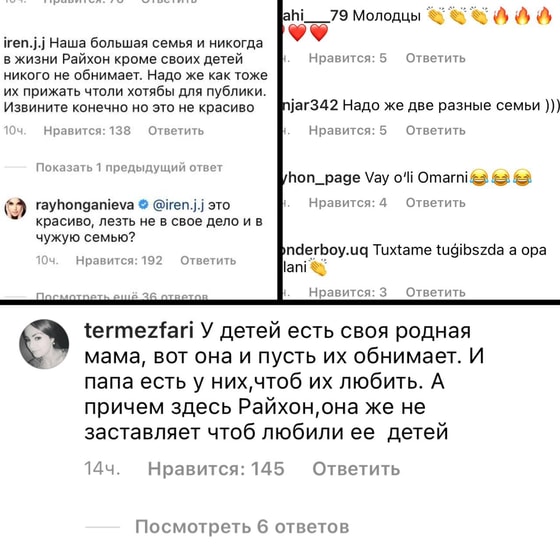 «Наша большая семья и никогда в жизни Райхон кроме своих детей никого не обнимет. Можно было и их тоже прижать к себе, хотя бы для публики. Извините конечно, но это некрасиво», «Надо же, две разные семьи», «Мои, твои, когда уже будут общие?», «Очень некрасиво»,