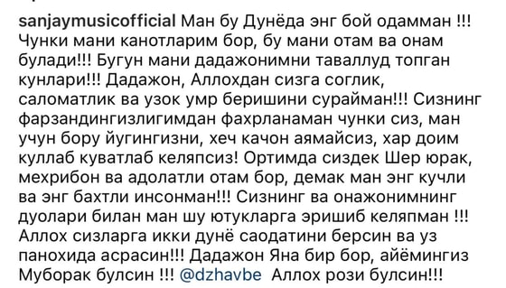 Узбекский исполнитель и автор песен San Jay выложил поздравительный пост и поблагодарил за все успехи своего отца.