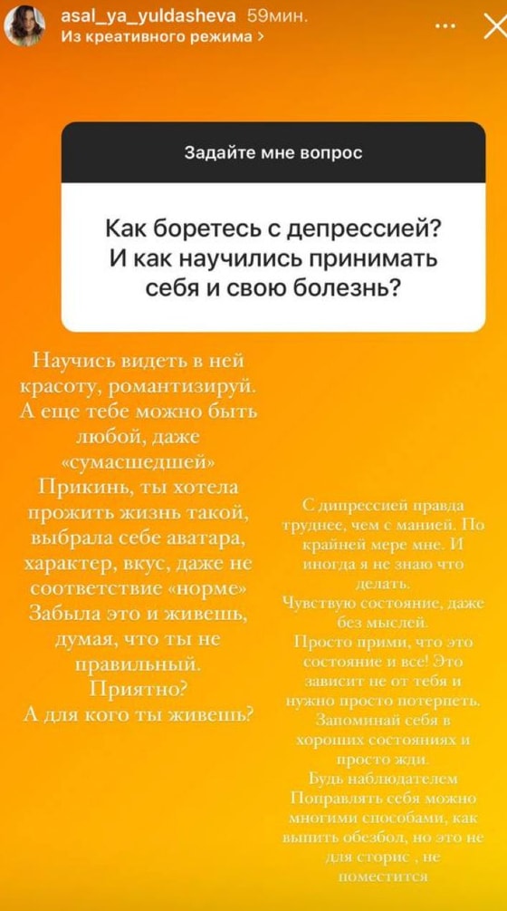 В апреле этого года блогер и по совместительству сестра певицы Лолы Юлдашевой – Асаля Юлдашева впервые рассказала, как она справляется с биполярным расстройством.