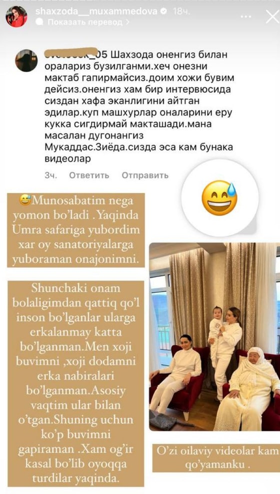 По словам Гульмиры Мухаммедовой, дочь не признавала ее, потому что «летает по звездному небу». Она считала, что Шахзода Мухаммедова на пике популярности и не замечает ничего вокруг.