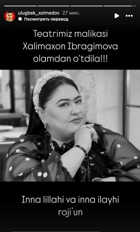 О смерти 45-летней актрисы сообщил актер и ее коллега Улугбек Холмедов.