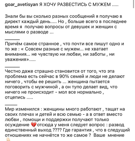 Российский звездный визажист Гоар Аветисян выложила новую публикацию в Instagram, под которым высказала свои мысли про разводы в семьях.