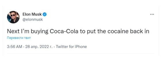 Глава компаний Tesla и Space X Илон Маск пообещал поклонникам приобрести компанию Coca-Cola вслед за Twitter. Об этом он сообщил в своем Twitter-аккаунте.