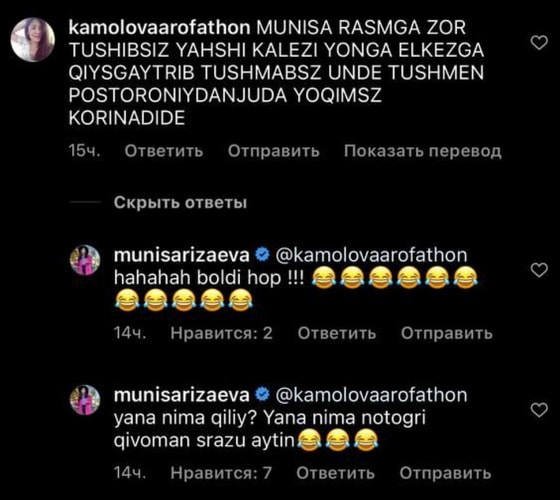 В комментариях практически все поклонники одобрили выбор певицы, назвав ее самой красивой и талантливой исполнительницей Узбекистана. Однако нашлась подписчица, которая похвалила позу Мунисы Ризаевой и дала совет, как не стоит наклонять голову на фотографиях.