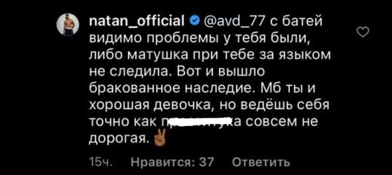 В ответ на свою поддержку артист получил негативный комментарий от одной из подписчиц. Неожиданно, Натан решил ответить недоброжелательнице в грубой форме и задел тему ее семьи.