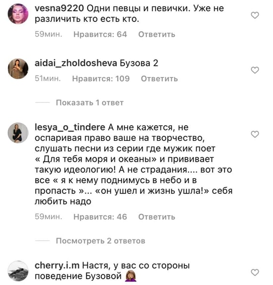 В комментариях под публикацией, пользователи отметили, что вокал это не ее сильная сторона и даже сравнили ее с Ольгой Бузовой, которая начала петь после расставания с Дмитрием Тарасовым.