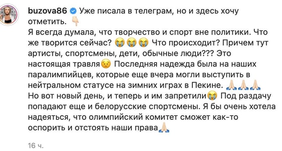 Это настоящая травля, последняя надежда была на наших паралимпийцев, которые еще вчера могли выступить в нейтральном статуте. Наступил новый день, и им запретили, – написала Бузова.