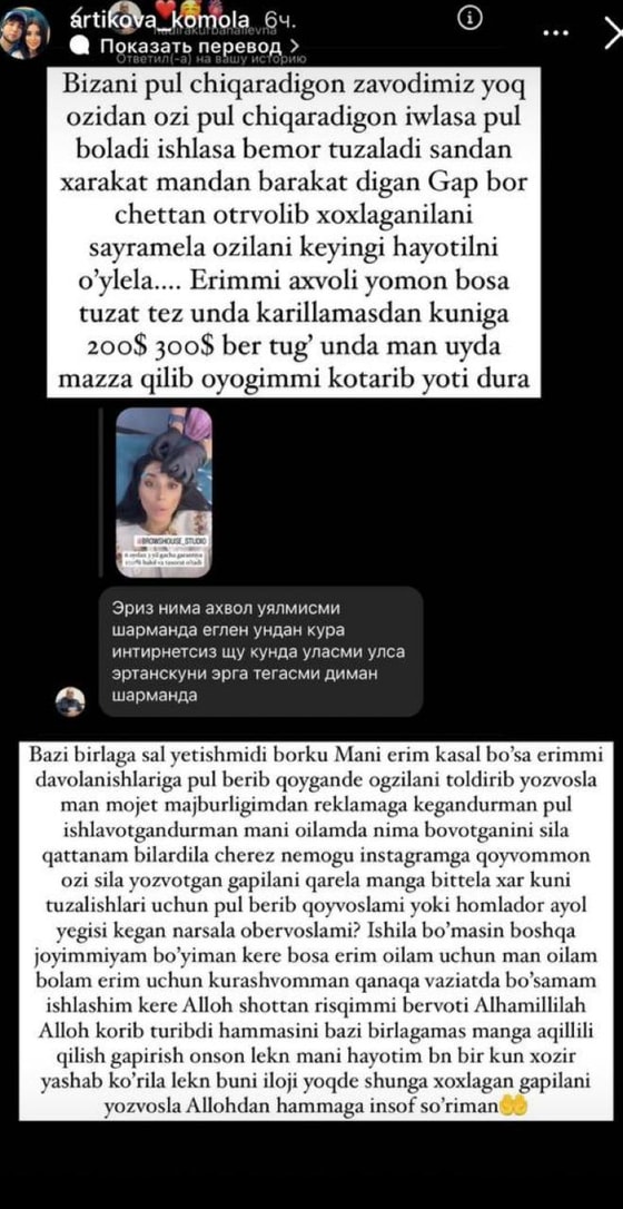 Камола Артикова попросила раскритиковавшую подписчицу давать ей каждый день $200-300, чтобы она могла расслаблено лежать дома и не заниматься рекламой.