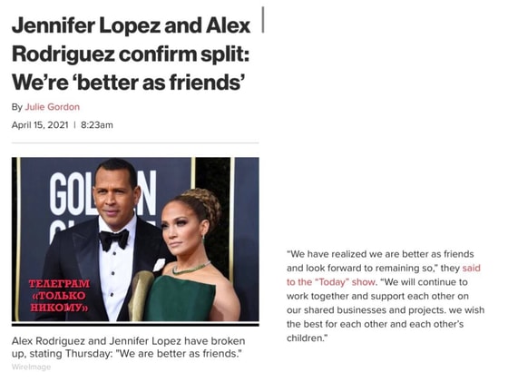 Напомним, в марте зарубежные СМИ сообщили, что распалась одна из пар Голливуда: Дженнифер Лопес и Алекс Родригес расстались после четырех лет совместной жизни.