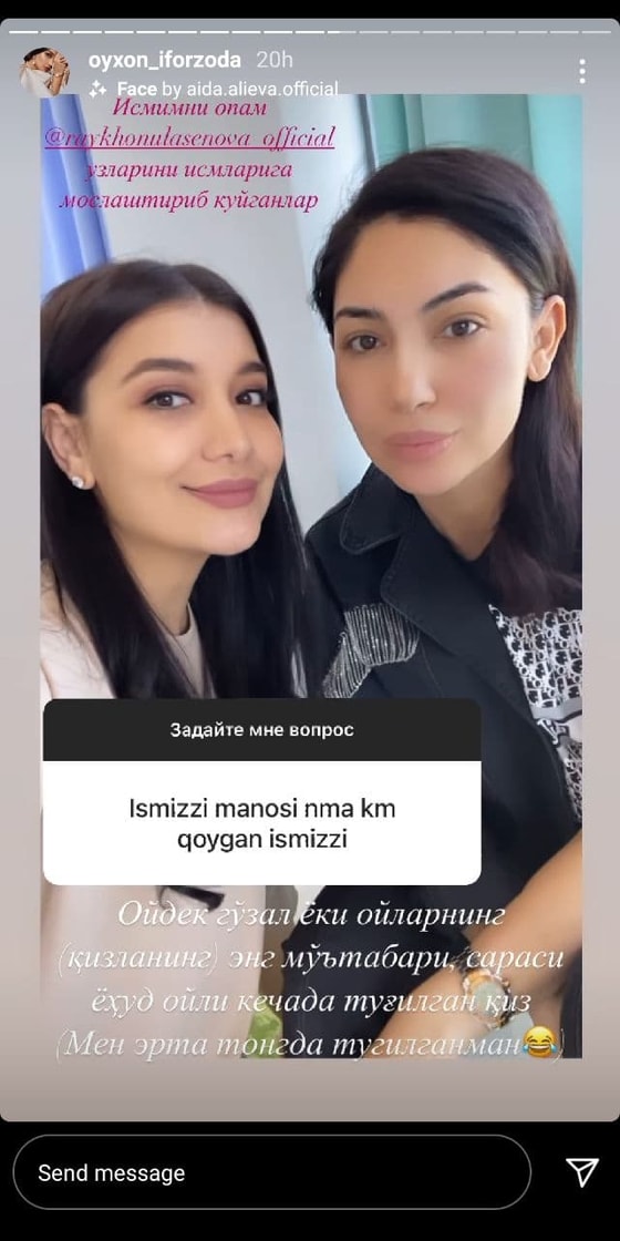 В своих stories ведущая Ойхон Ифорзода устроила опросник. Подписчики задавали разные вопросы. На вопрос о ее имени она рассказала, кто назвал ее Ойхон и что означает это имя.