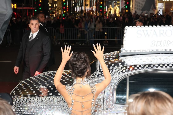 Внимание прессы также привлекло такси, которое привезло ее и ее подруг на вечеринку. Автомобиль был полностью покрыт кристаллами.
