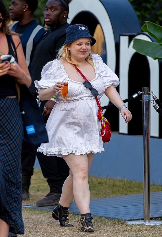 Для мероприятия актриса выбрала белое платье-футляр с рукавами-фонариками, дополнив его черными сапожками с золотыми пряжками. Чтобы защититься от солнца, Никола надела синюю панаму и солнцезащитные очки. В качестве аксессуара она выбрала красную кожаную сумку, украшенную радужными бусинами.