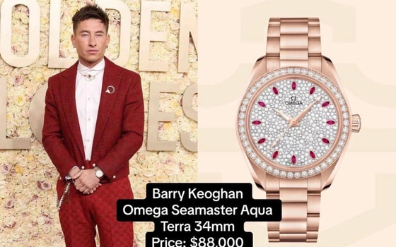 Актер фильма «Солтберн» Барри Кеоган предстал в часах от Omega Seamaster Terra с корпусом и браслетом из фирменного золотого сплава, украшенным бриллиантами циферблатом и рубиновыми часовыми метками и броши Tiffany & Co за $88 тыс.