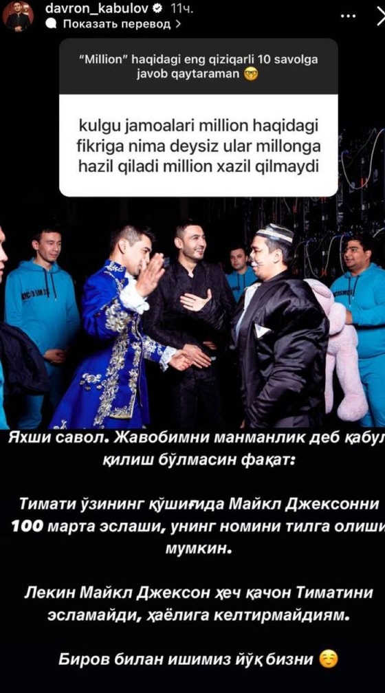 Узбекский шоумен и ведущий юмористического шоу «Миллион» Даврон Кабулов ответил на вопросы поклонников касательно выступлений коллектива.