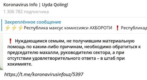 На том же совещание президент подчеркнул: «Почему они [председатели и другие работники махаллинского комитета – прим.авт.] должны оставаться в стороне в такой сложной ситуации? Каково состояние населения, кто и в каком доме болен, у кого какой уровень достатка, кто нуждается в помощи, а кому нужен врач - об этом на низовом уровне никто не знает так хорошо, как представители махалли».