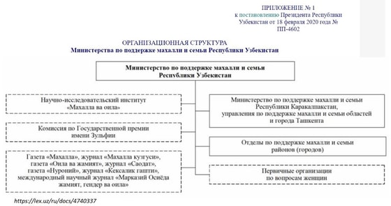 А уже 18 февраля 2020 года был принят указ президента о создании Министерства по поддержке махалли и семьи. В структуре министерства образовывается Научно-исследовательский институт «Махалла ва оила». А Комитет женщин Узбекистана, Республиканский совет по координации деятельности органов самоуправления граждан и территориальные отделения фонда «Нуроний» – упраздняются. Их функции были возложены на подразделения создаваемого министерства.
