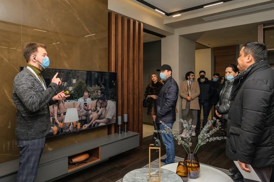 Гостям резиденции провели экскурсию по просторному лобби, трем меблированным шоурумам, представители рассказали о множестве бонусов при покупке апартаментов на первой линии: предчистовая отделка, возведенные перегородки по индивидуальному дизайну, центральное кондиционирование от Mitsubishi, панорамное остекление от Schüco, систему умного дома и многое другое.